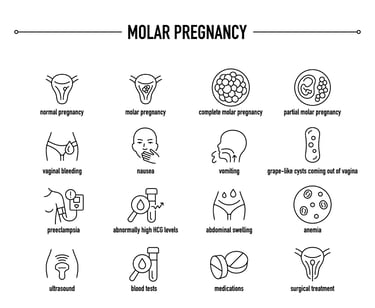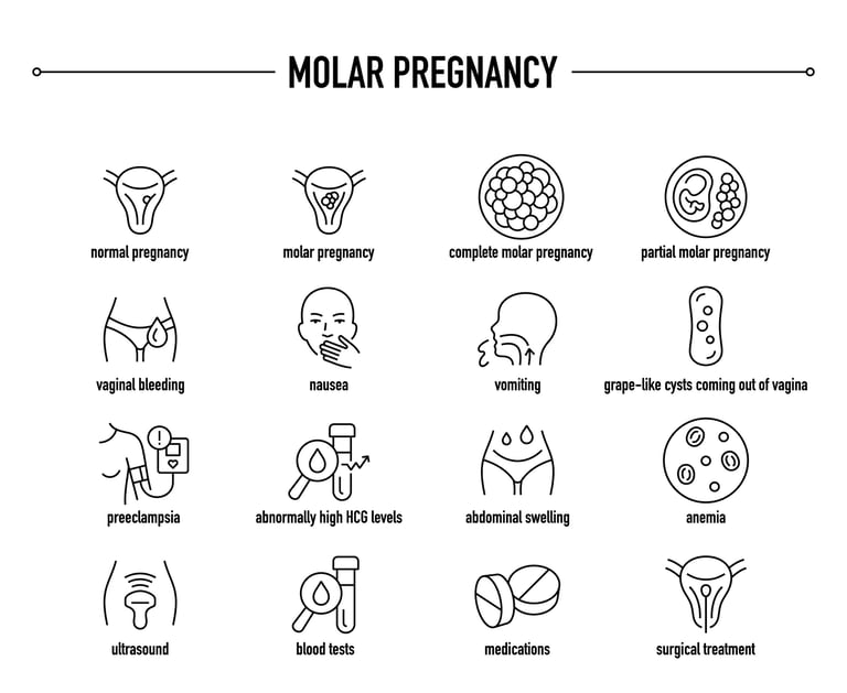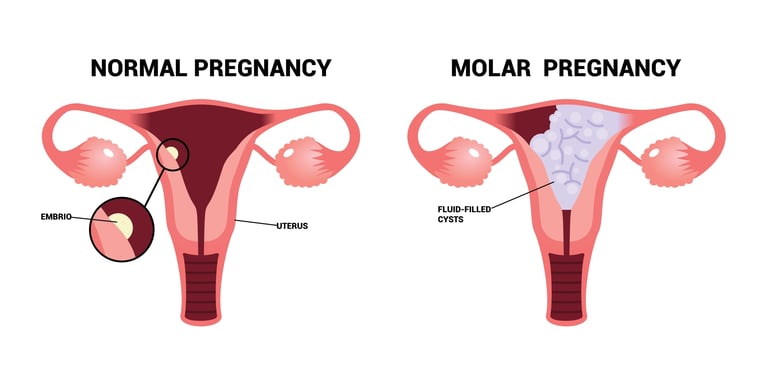 Hidatiform Mol (Molar Gebelik): Hidatiform mol, plasentanın anormal bir şekilde büyüdüğü ve trofoblastik hücrelerin anormal hızda çoğaldığı bir durumu ifade eder. Bu durum normal fetal gelişimin durduğu ve fetusun gelişmediği bir gebelikle sonuçlanır. Hidatiform mol tam ve kısmi olarak iki alt tipi içerebilir.