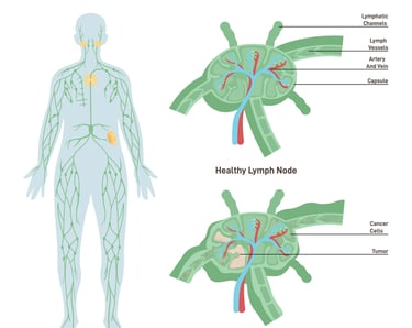 Lymph node cancers are types of cancer that affect the lymph nodes, which are part of the lymph system. The importance of these cancers comes from the fact that the lymph system performs vital functions such as fighting infections and maintaining fluid balance in the body. The most common lymph node cancers are known as Hodgkin lymphoma and non-Hodgkin lymphoma. These cancers are characterized by abnormal accumulation of lymphocytes in the lymph nodes, spleen, bone marrow, and sometimes blood. Lymphomas can weaken the body's immune system, making it vulnerable to infections and other diseases. Early diagnosis and treatment can significantly improve survival rates and quality of life for lymphoma patients. But the symptoms of lymphomas can often be confused with other more common diseases, making diagnosis difficult. Public awareness about lymphoma and the development of early detection methods are critical in the fight against these types of cancer. Modern treatment methods are constantly improving as research in this field continues and offer promising results for patients.